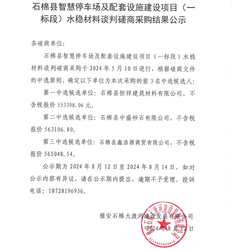 石棉縣智慧停車場及配套設(shè)施建設(shè)項目(一標段)水穩(wěn)材料采購談判磋商采購結(jié)果公示