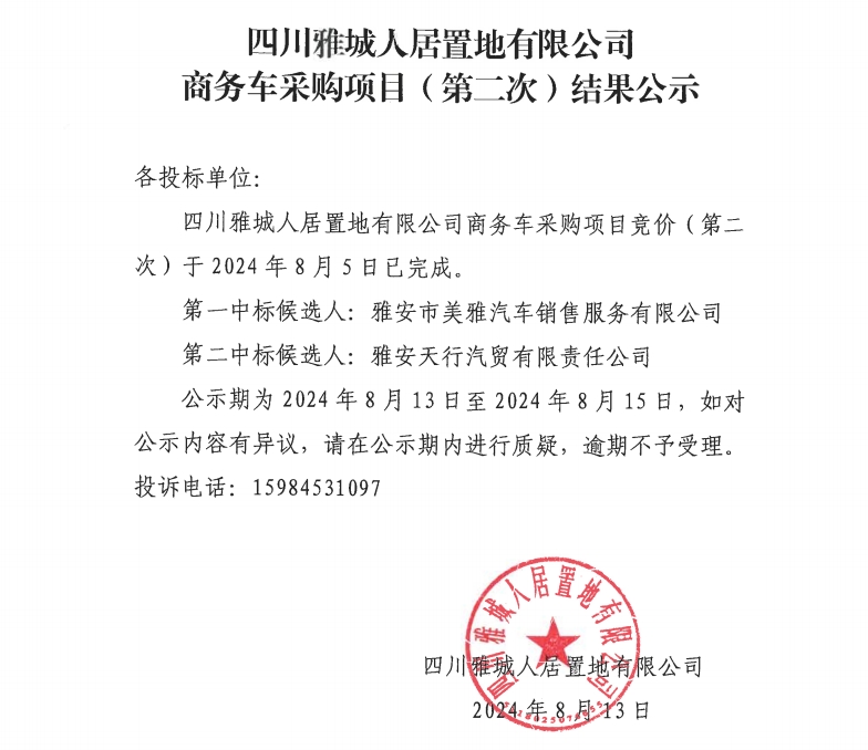 四川雅城人居置地有限公司商務(wù)車采購(gòu)項(xiàng)目(第二次)結(jié)果公示