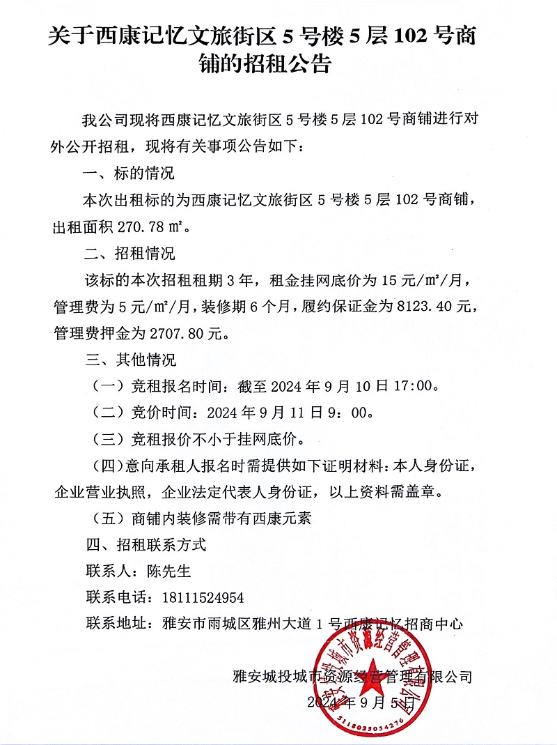 關(guān)于西康記憶文旅街區(qū)5號(hào)樓5層102號(hào)商鋪的招租公告