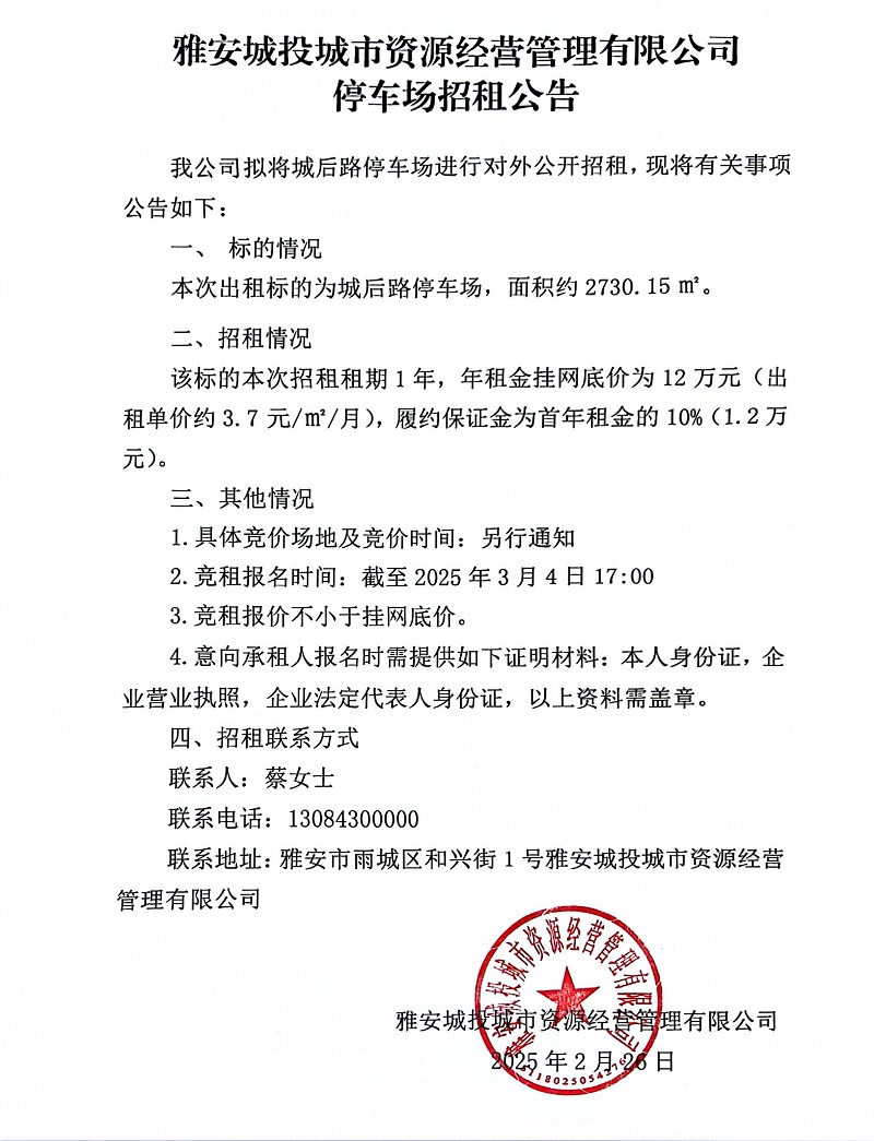 雅安城投城市資源經(jīng)營(yíng)管理有限公司停車場(chǎng)招租公告