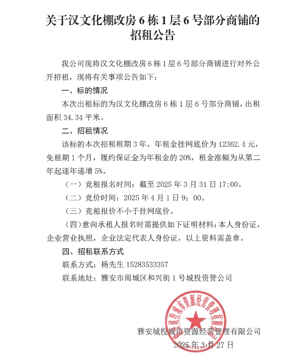 關于漢文化棚改房6棟1層6號部分商鋪的招租公告