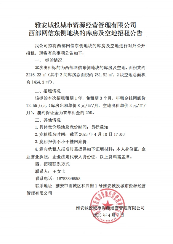 雅安城投城市資源經(jīng)營管理有限公司西部網(wǎng)信東側地塊的庫房及空地招租公告
