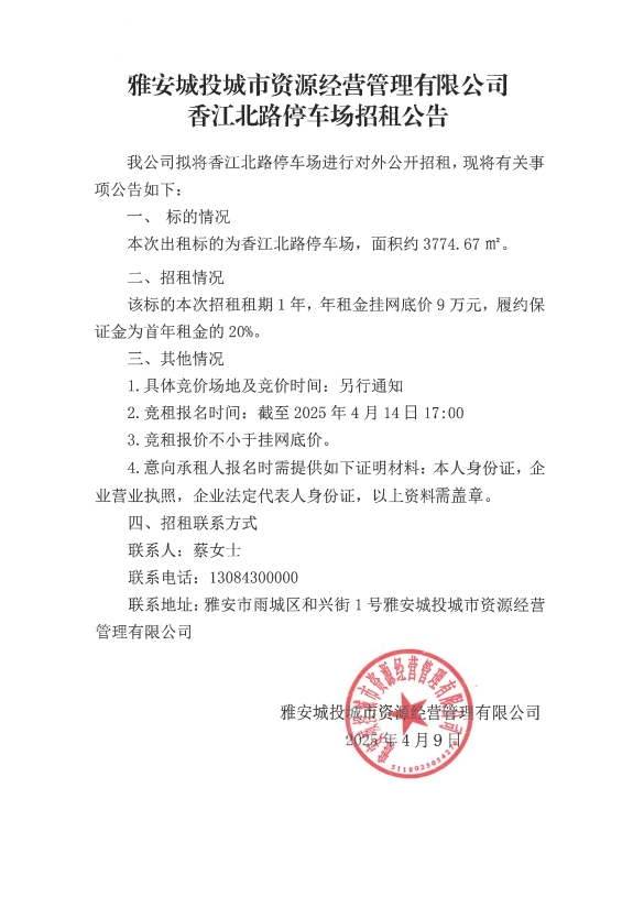 雅安城投城市資源經(jīng)營(yíng)管理有限公司香江北路停車場(chǎng)招租公告