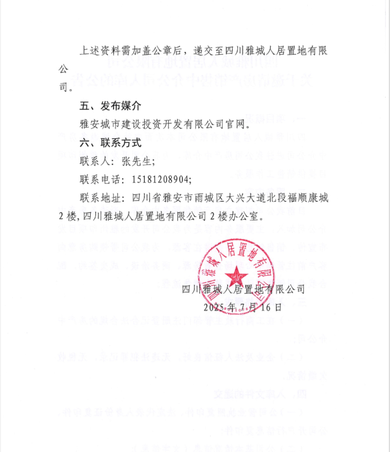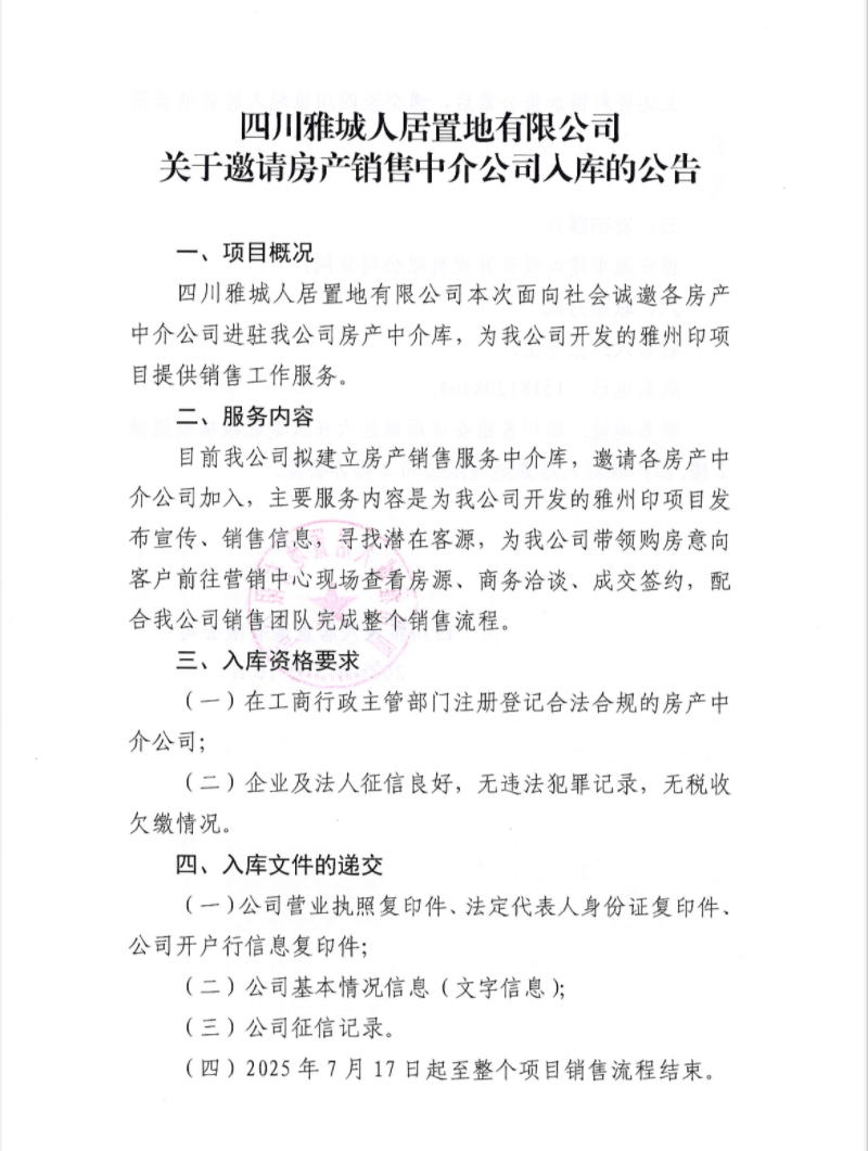 四川雅城人居置地有限公司關于邀請房產銷售中介公司入庫的公告