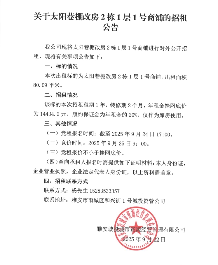 關(guān)于太陽巷棚改房2棟1層1號(hào)商鋪的招租公告