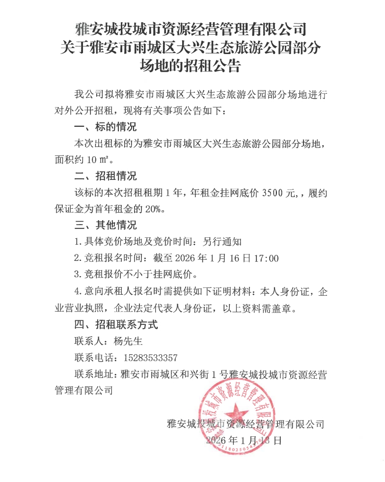 雅安城投城市資源經(jīng)營管理有限公司關(guān)于雅安市雨城區(qū)大興生態(tài)旅游公園部分場地的招租公告