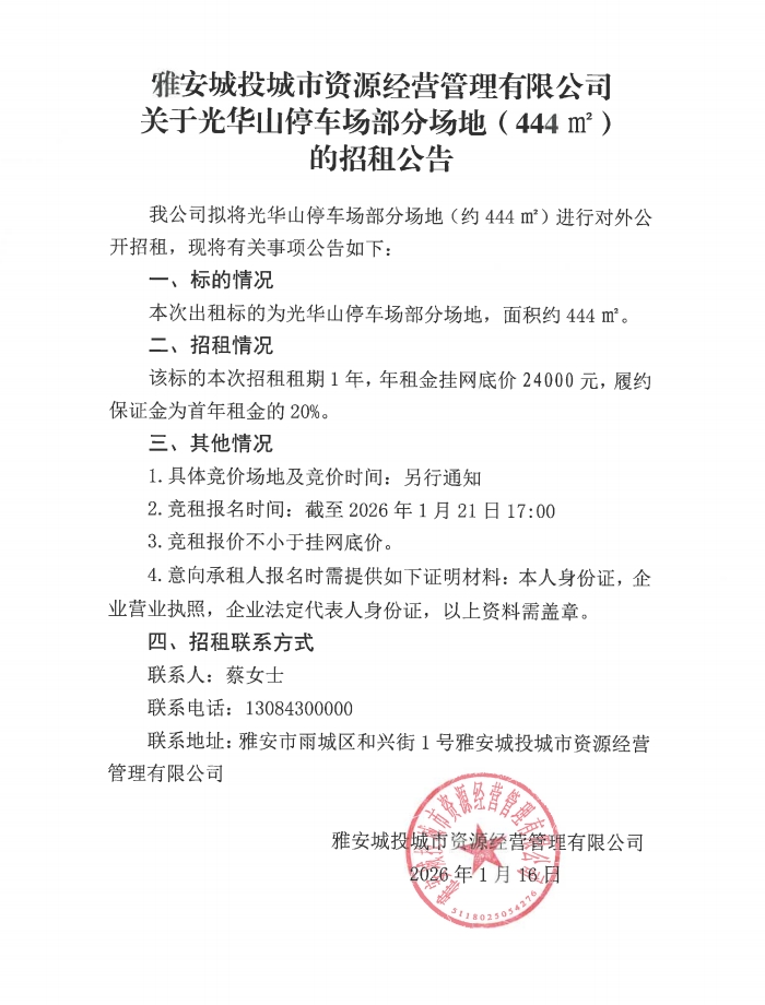 雅安城投城市資源經(jīng)營(yíng)管理有限公司關(guān)于光華山停車場(chǎng)部分場(chǎng)地(444㎡)的招租公告