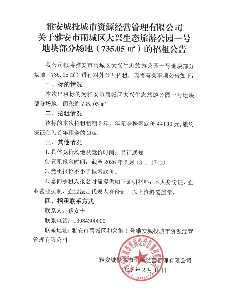 雅安城投城市資源經(jīng)營管理有限公司關(guān)于雅安市雨城區(qū)大興生態(tài)旅游公園一號(hào)地塊部分場(chǎng)地(735.05㎡)的招租公告