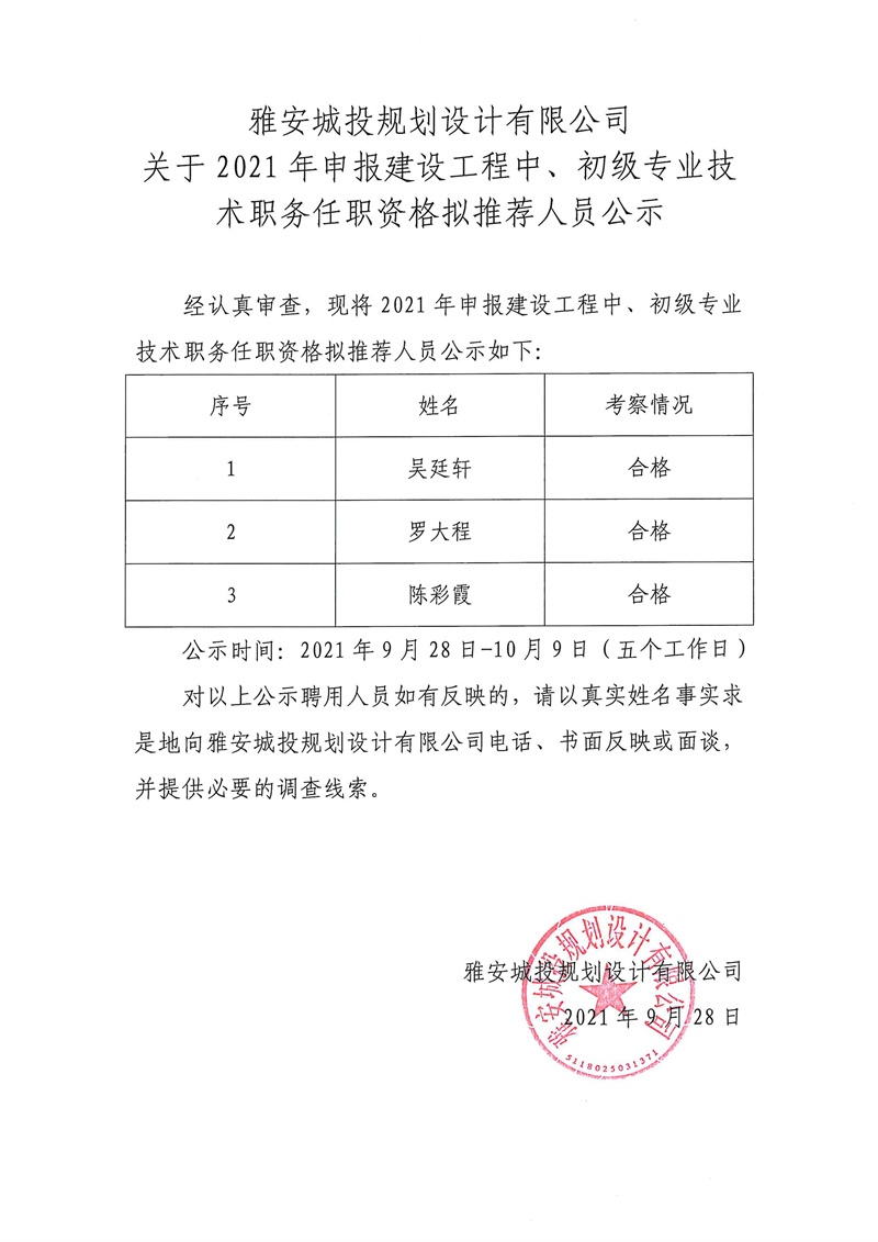 雅安城投規(guī)劃設計有限公司關于2021年申報建設工程中、初級專業(yè)技術職務任職資格擬推薦人員公示