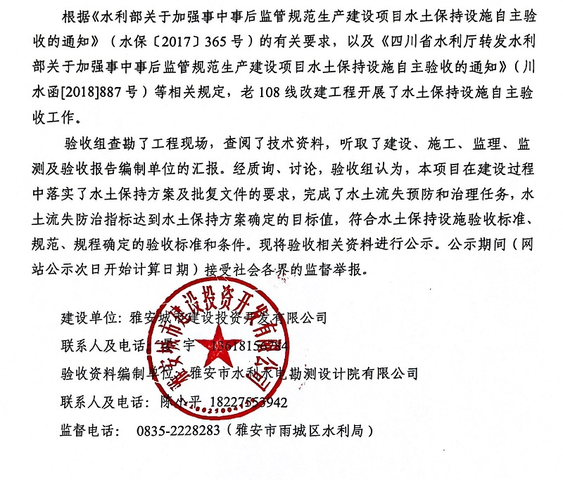 關于老108線改建工程水土保持設施自主驗收情況的公示